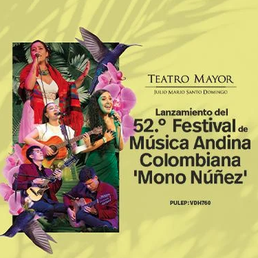 Home / Agenda / Mono Núñez Festival brings Andean music showcase to Bogotá’s Teatro Mayor Mono Núñez Festival brings Andean music showcase to Bogotá’s Teatro Mayor Date Sunday, April 19 - 19, 2026 Time 5:00 pm - 8:00 pm Venue Teatro Mayor Julio Mario Santo Domingo Cl. 170 No.67-51 Price $135.000 Get Tickets Launch of the 52nd edition of the Andean Folk Music Festival Moño Nuñez. Tags: AgendaAndesCultureFestivalsMono MuñezMusicNewsTeatro Mayor SHARE EVENT Share this event COPY LINK WHATSAPP X (TWITTER) FACEBOOK LINKEDIN TELEGRAM