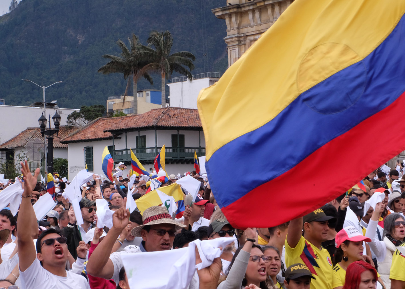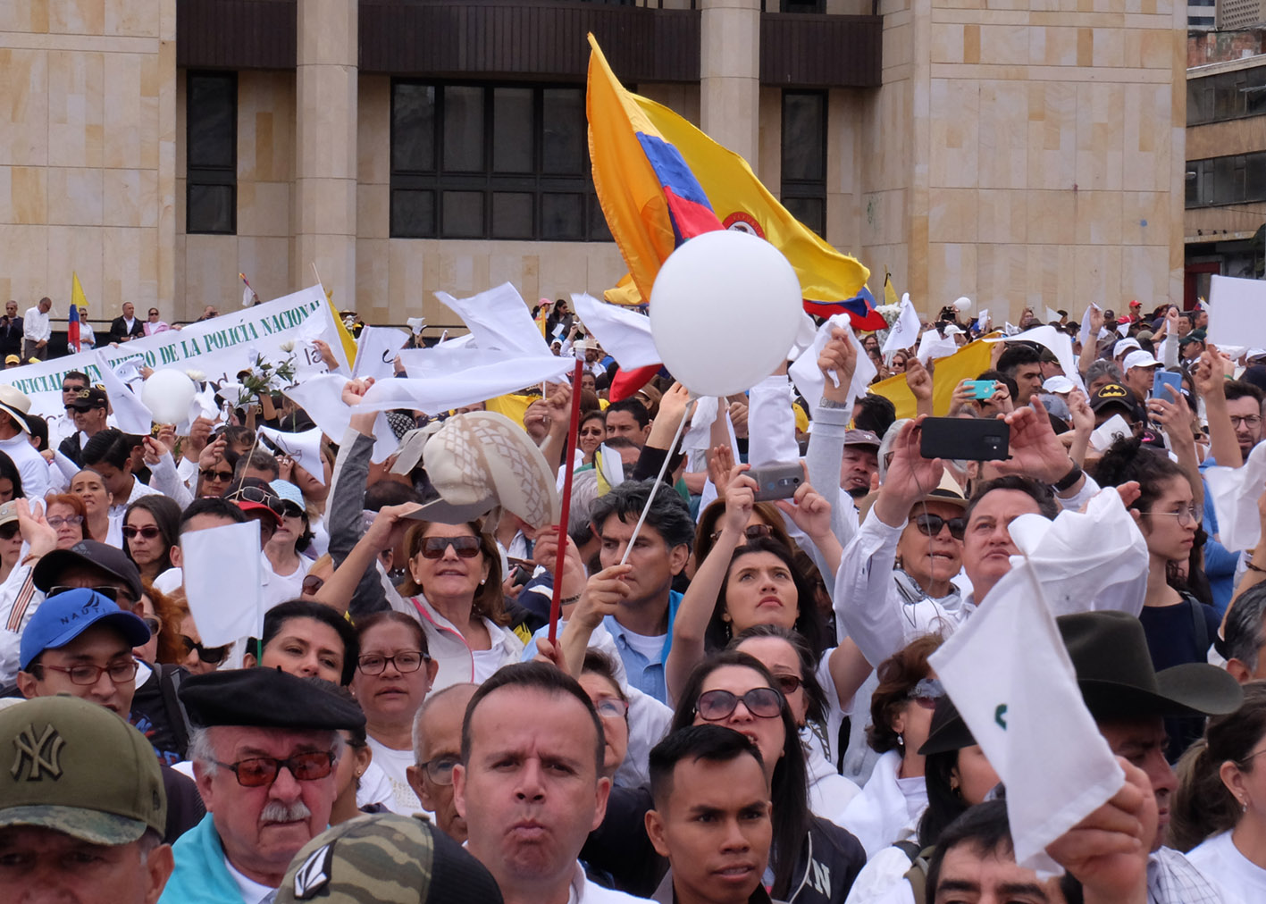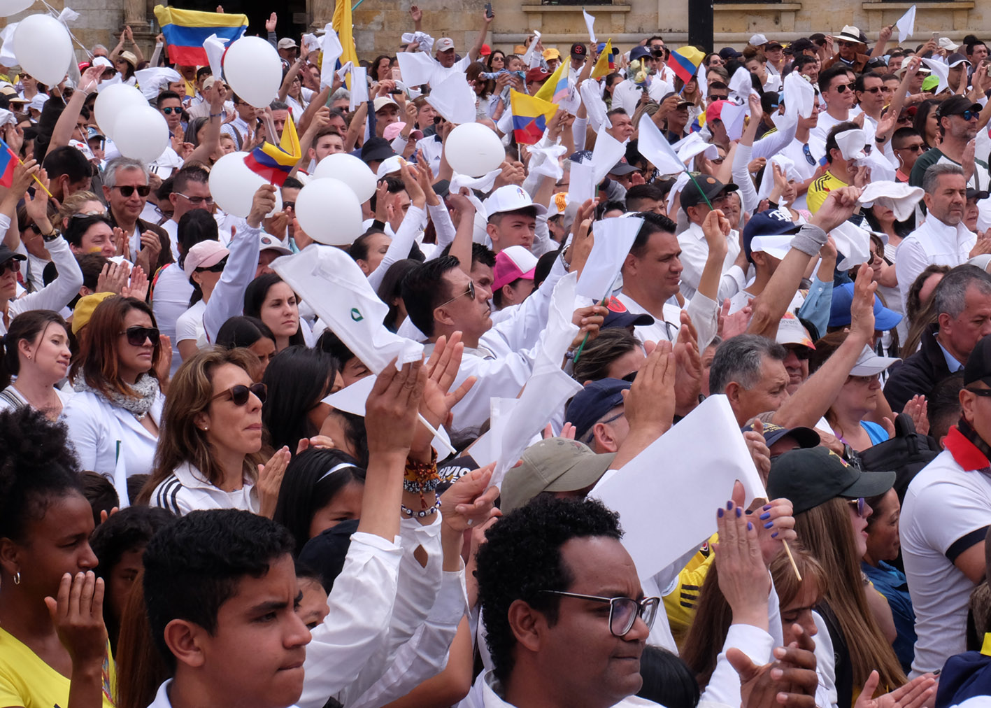As the crowd reached the Plaza de Bolívar many chanted slogans condemning the ELN (Ejercito de Liberación Nacional) and carried white flags in support of peace.