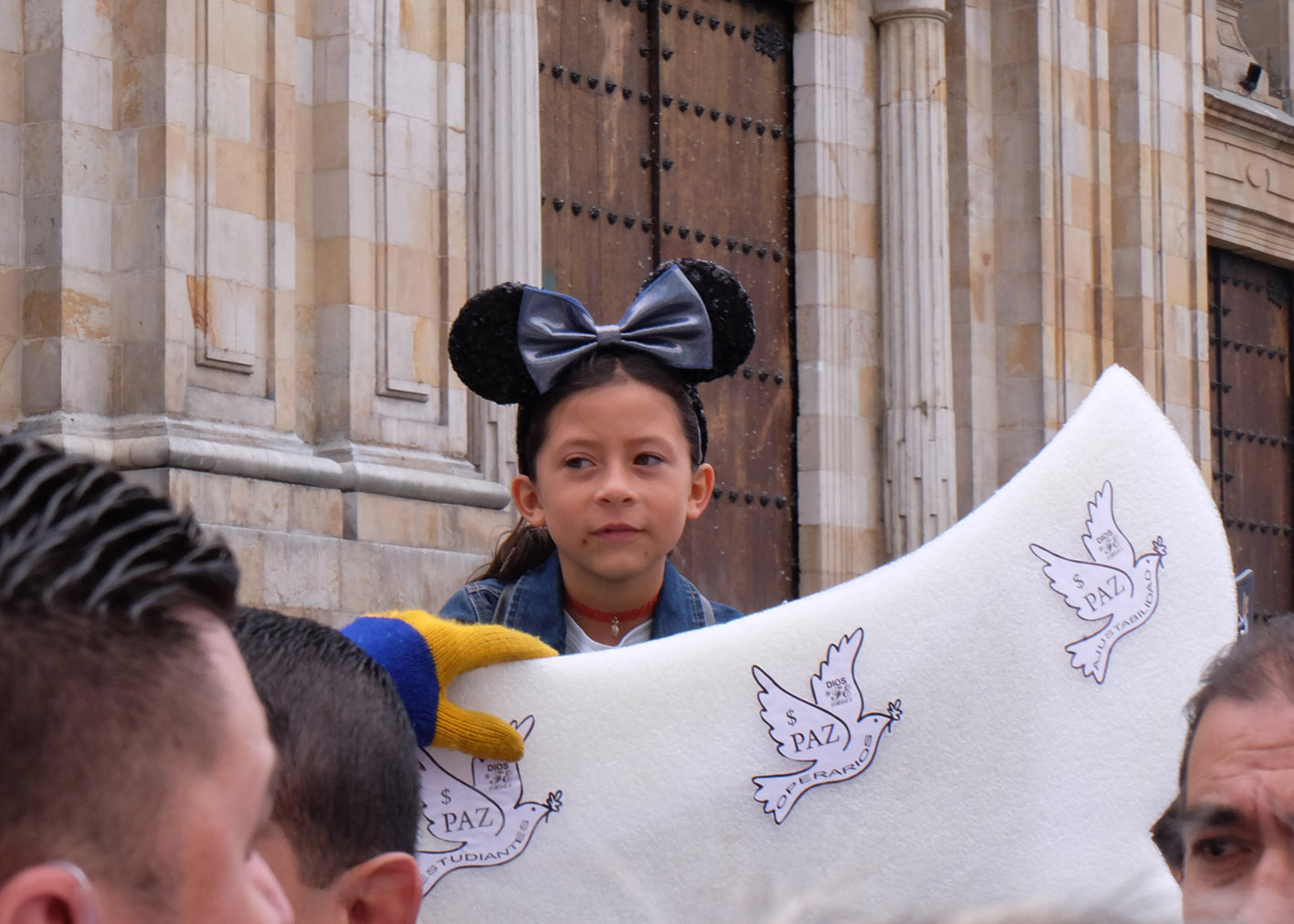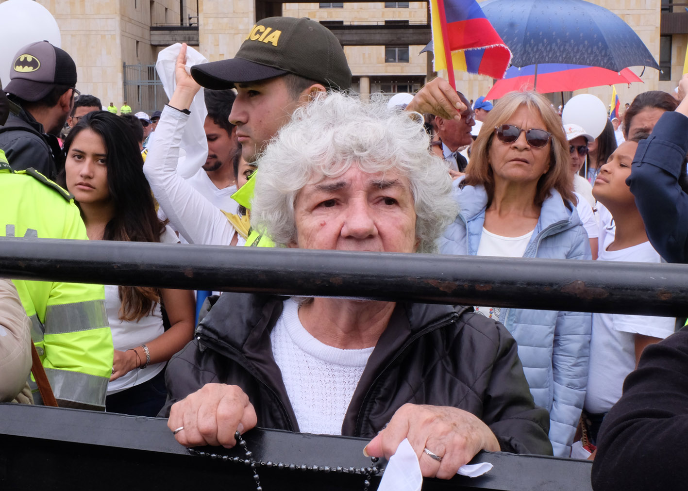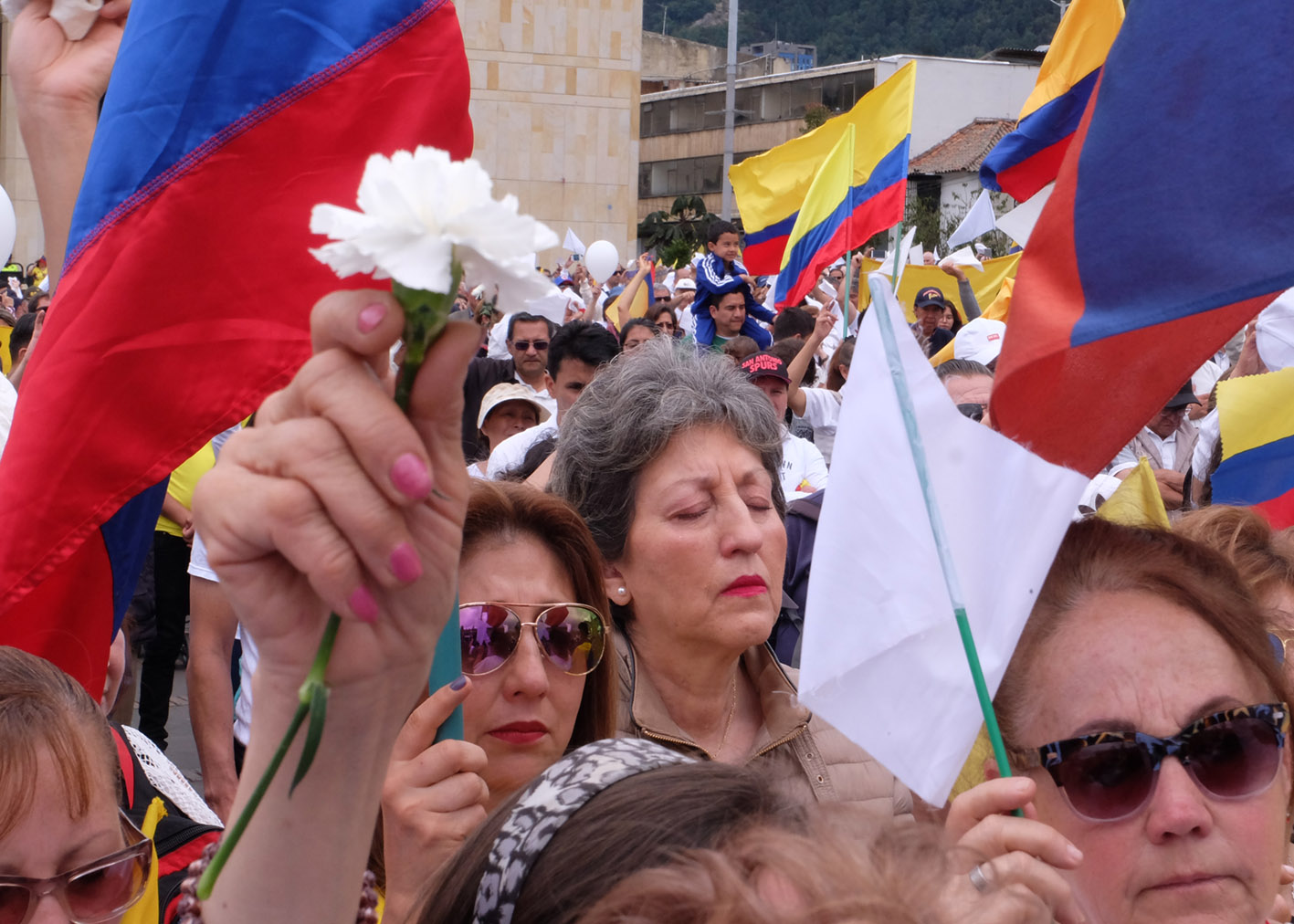 As the crowd reached the Plaza de Bolívar many chanted slogans condemning the ELN (Ejercito de Liberación Nacional) and carried white flags in support of peace.