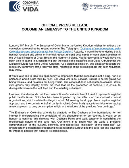 The Colombian Embassy to the United Kingdom released an official statement regarding an article that was published in The Telegraph titled: ‘Duchess of Northumberland asks Colombia to send coca plants for her Poison Garden’. The story, dated March 13, claims that Jane Percy had contacted the Colombian Government to source coca plant seedlings and coca seeds for the Poison Garden at Alnwick Castle. The Poison Garden at her family’s estate is used to educate the public and schools about drugs.