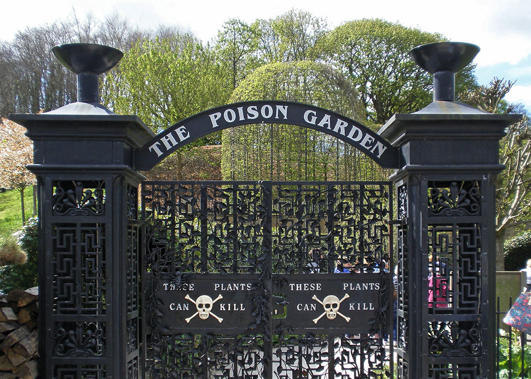 Visitors to the Poison Garden are not allowed to touch the plants, and a sign on the iron gates warns “These Plants Can Kill”. The formal gardens include species of Strychnos nux-vomica (source of strychnine), hemlock, Ricinus communis (source of harmless castor oil, but also deadly ricin), foxglove, Atropa belladonna, Brugmansia and Laburnum.