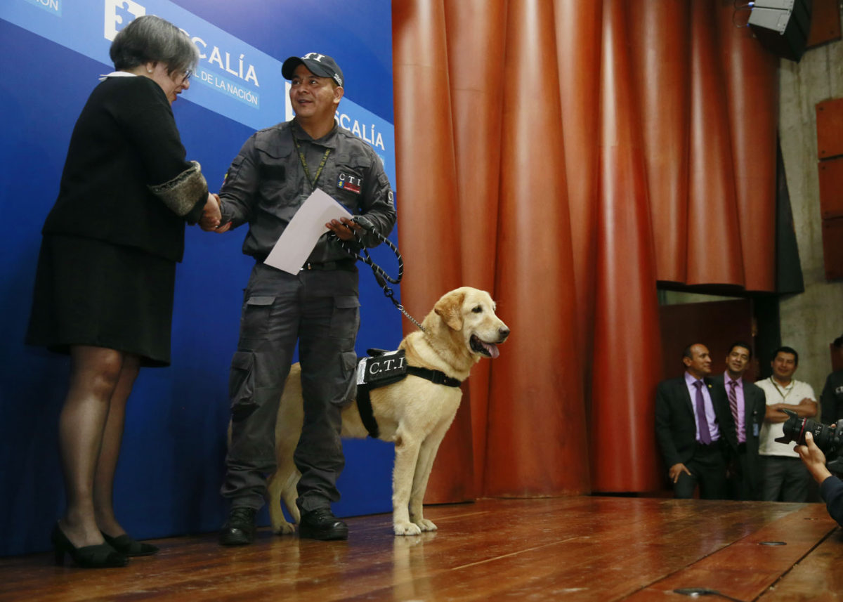 The country’s Deputy Attorney General, María Paulina Riveros, decorated the 14 dogs, and their respective instructors, assigned to judicial entity’s Canine Group. The group counts with 90 dogs and is responsible for operations that include drug trafficking interdiction, dismantling organized crime networks, and searching for missing persons. Among the dogs reaching retirement was Max, who recently led the rescue to find the bodies of the three Ecuadorian journalists killed by the ex-FARC dissent, alias ‘Guacho.’