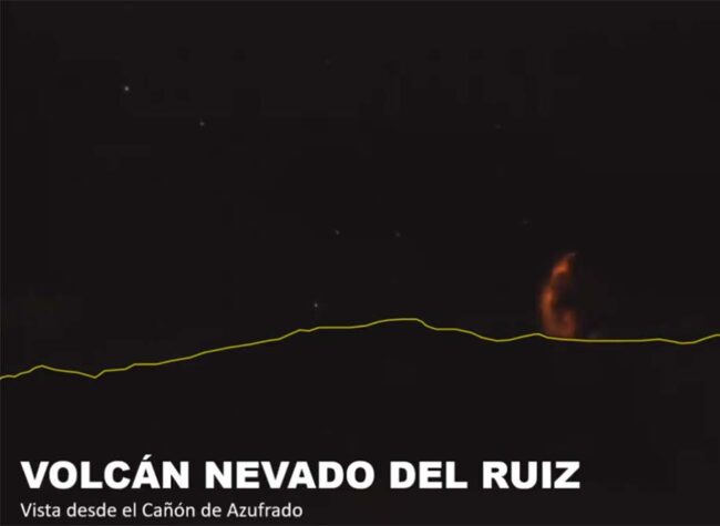 Capture of the Nevado del Ruíz's incandescent plume of ash on July 2, 2023. Credit: Telecafe
