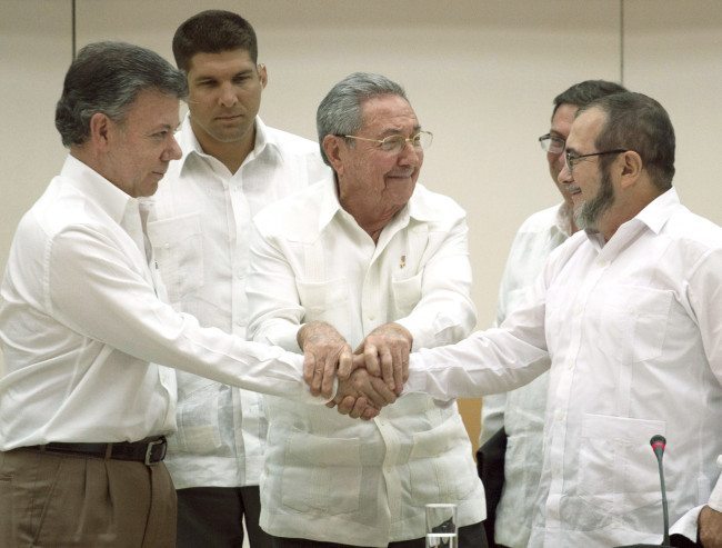 Colombia seals peace with a handshake During an historic encounter in Havana, the Colombian government and FARC announce that a peace deal will be reached before March 2016. RICHARD EMBLIN 7:36 PM ET