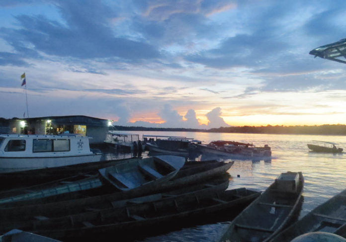 After settling into our hotel, heavy rainfall brings the temperature down a couple of degrees and the “sleepy town” suddenly comes to life with the buzz of three-wheeled motocarros racing along narrow streets. Exotic fruits and vegetables are precariously stacked on busy sidewalks, church music merges with Latin Pop beats and smiling shopkeepers wave from behind colorful t-shirts, pink umbrellas and chicken roasting on a spit. Pablo Flórez, our guide and essential translator, points me in the direction of a shop where, for $10,000 pesos I can purchase a pair of knee-high rubber boots to complete my jungle attire.